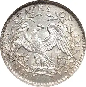 The obverse of the Draped Bust half dime was based on a sketch by artist Gilbert Stuart, with the dies engraved by Robert Scot and John Eckstein. The primary 1796 variety bears fifteen stars representing the then number of states in the union. In 1797, fifteen and sixteen star varieties were produced – the sixteenth star representing newly admitted Tennessee – as well as a thirteen star variety after the mint realized that it could not continue to add more stars as additional states joined the union. The reverse bears an open wreath surrounding a small eagle perched on a cloud. 54,757 half dimes of this design were minted.[7]