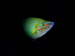 The juvenile has a light blue-green background color with many orange stripes. It has also two black ocellus: the first one on top part of its caudal peduncle and the second one in the middle of its dorsal fin. A black spot occurs on the first rays of the dorsal fin. Juveniles and females have in common an orange anal fin.