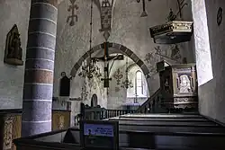 The triumphal cross is a copy of the original, today found in the Museum of Gotland in Visby. The original, from the 12th century,[1] is supposedly one of the oldest wooden sculptures with still original paint in Europe.[2] Most other furnishings are from post-Reformation times. So for example are the pews from the 17th and 18th centuries, the pulpit from 1619 and an epitaph for Elisabeth Persdotter Lythe (who died in 1652).[3] The church has a votive ship from 1871.[1]
