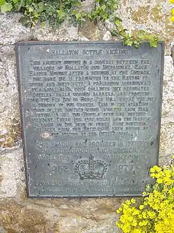 Bottle-kicking is an old Leicestershire custom that takes place in the village of Hallaton each Easter Monday.[1] It is an outdoor sport played across a mile-long playing area, in which two teams attempt to move a wooden barrel (known as a "bottle") across the opposing team's stream at the far end of the area.