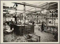Historically in France, the health responsibilities of local authorities have led to the management of a slaughterhouse on land belonging to the municipality, which another company can take over; the whole operation is budgeted with the taxes collected.[12] The slaughterhouse complex is an economic entity of great importance at a time when meat consumption is rising sharply. Thanks to rapid rail transportation, affects the established structure of meat animal production and thus expands the regional scale. Based on the Chicago Slaughterhouse, the Mouche industrial complex distinguishes two businesses: slaughter and trade. Associated with the slaughterhouse was a leather and gut business in the Gerland district, with outlets for leather goods, tennis racket strings, and surgical ligatures. In 1966, national legislation placed this activity under the jurisdiction of the Grand-Lyon.[2] Cattle traders, butchers, charcutiers, and tripe butchers worked here until 1967 when the slaughterhouse was moved to Corbas. In the last period, this know-how was divided among 57 companies of the new non-local economic structure: the Régie Cibieval (created in 1975).[13] In 1967, the Gerland buildings were abandoned.