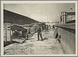The resumption of the construction work was in 1924 and the inauguration of the slaughterhouse and market was on September 9, 1928.[4] The area was 240,000 square meters. The market accommodated 4,000 cattle, 8,000 sheep, and 3,500 pigs.