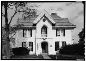 Vaux included the design in his book Villas and Cottages (1857) as Design No. 10, "Suburban House with Attics," and specified it had been a collaboration with Withers. Most unique about the house is its "recessed porch," which Vaux believed "materially helps to relieve what would otherwise be a monotonous front." He meant for the upper balcony to be enclosed by glazing in the winter.[4] Mainly for the development of the porch, which carries a semi-Palladian air in its oculus window, the house has been regarded as noteworthy in antebellum Italian-inspired architecture.[5]
