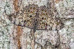 In Mexico, the adults are on the wing all year, but are most common between June and September.[1] The larvae feed on vines in the family Euphorbiaceae; in South America, Dalechampia triphylla is often the host plant. The adult butterflies feed on rotting fruit. They often perch head-down, flattened against the surface of tree trunks; their colouring makes them well-camouflaged against the bark. When a butterfly approaches, a male will fly out, making a characteristic cracking sound, probably by means of a pair of rods on the abdomen. If the new arrival is a male it will click in response, while if a female, it will remain silent.[1] Females also perch on tree trunks, but in an experiment it was found that when offered perching places that were black, grey or white, males showed a preference for white while females preferred grey.[2]