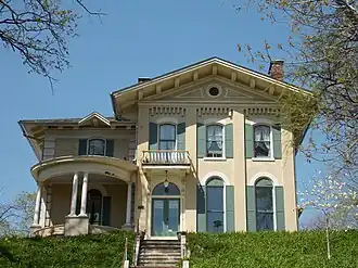 The geographical location of the Hamburg District is a fairly steep bluff north of the downtown area. The sidewalk on Ripley Street is replaced by steps as it climbs the hill. The area has the largest concentration of historically significant houses in Davenport.[9] As with other areas of the city, the simple Greek Revival style was the first to appear in Hamburg. These homes are generally at the base of the hill. The style is realized in cottages and the more popular two-story, 3-bay front gable homes. Other homes in the district include large Victorian homes in the Gothic Revival, Second Empire, Italianate, and the Queen Anne styles built in the 19th century. Many of these homes crown the bluff and offer vistas overlooking the river valley below. There are also examples of early 20th century Georgian Revival and American Craftsman homes. The historic district is rounded out by smaller and more simple late 19th and early 20th century homes and a few modern dwellings.