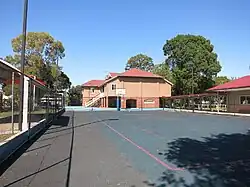 Other additions to the site have been made. Hamilton State School showed a strong interest in sport from early in its history, with a netball court on-site by July 1925 and a tennis court in situ by May 1930, both on the north side of the school building.[85][86][87] Although sporting facilities were limited by the small size of the school's grounds, venues outside the school were used, for instance, in 1953 the school used the Hamilton Shift-workers Rugby League Club Oval at Hamilton.[88] A parade ground was created east of the school building by 1967.[89] The tennis court was converted to a multipurpose court by 1998.[90] The site of the netball court gained a new purpose in 2012 when a federally funded library-administration block was constructed in the northwest corner of the site, adjacent to the tennis court.[91] A preschool building has been added in the southwest of the grounds.[1]