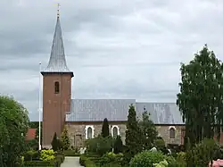 Hammel Church was originally constructed in the romanesque style c. 1100. Its nave and part of the choir date to the 12th century, while the tower was added in the 17th and altered in the 19th century.[6] In 1558, the king ordered that the nearby Jernit Church be demolished and its possessions be transferred to Hammel, thus expanding the size of Hammel's parish.[9][6] Today, the church is considered a road church.[10]