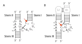 The minimal hammerhead ribozyme is composed of three base paired helices, separated by short linkers of conserved sequence as shown in the crystal structure.[34] These helices are called I, II and III. The conserved uridine-turn links helix I to helix II and usually contains the sequence CUGA. Helix II and III are linked by a sequence GAAA. The cleavage reaction occurs between helix III and I, and is usually a C.