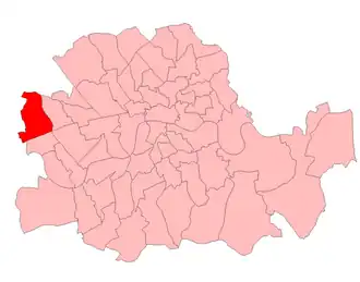 The last redrawing of the boundaries of the constituency took place prior to the February 1974 election. In 1965 the former metropolitan borough had become part of the larger London Borough of Hammersmith, and the seat was defined as consisting of ten wards of the London Borough, namely: Addison, Broadway, Brook Green, College Park & Old Oak, Coningham, Grove, St. Stephen's, Starch Green, White City and Wormholt.[1]