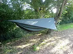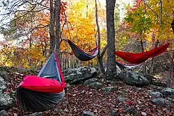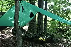 Hammock camping is a form of camping in which a camper sleeps in a suspended hammock rather than a conventional tent on the ground. Due to the absence of poles and the reduced amount of material used, hammocks can be lighter than a tent, though this is not always the case. Most hammocks will also require less space in a pack than a similar occupancy tent. In foul weather, a tarp is suspended above the hammock to keep the rain off of the camper. Mosquito netting, sometimes integrated into the camping hammock itself, is also used as climatic conditions warrant. Camping hammocks are used by campers who are looking for lighter weight, protection from ground-dwelling insects, or other ground complications such as sloped ground, rocky terrain and flooded terrain.[1]