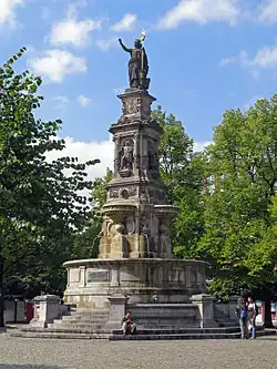 On 10 July 1878 the Hanseatic Building Society unveiled the 17m tall Hansa-Fountain (Hansa-Brunnen) at Hansaplatz in St. Georg as a present to the City of Hamburg. The fountain was designed by architects Heinrich Joseph Kayser and Karl von Großheim, the statue of Hammonia (including minor statues of Archbishop Ansgar, Adolf III of Holstein and Schauenburg, plus the Emperors Constantine and Charlemagne) were created by German sculptor Engelbert Peiffer.