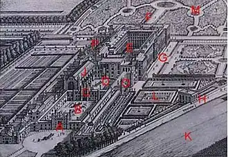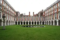 In the early 1690s, William III's massive rebuilding and expansion work, which was intended to rival the Palace of Versailles, destroyed much of the Tudor palace.[3] His work ceased in 1694, leaving the palace in two distinct contrasting architectural styles, domestic Tudor and Baroque. While the palace's styles are an accident of fate, a unity exists due to the use of pink bricks and a symmetrical, if vague, balancing of successive low wings.[4] George II was the last monarch to reside in the palace.