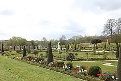 On the south side of the palace is the Privy Garden bounded by semi-circular wrought iron gates by Jean Tijou.[61] This garden, originally William III's private garden, was replanted in 1992 in period style with manicured hollies and yews along a geometric system of paths.[60]