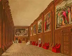 During the Tudor period, the palace was the scene of many historic events. In 1537, the King's much desired male heir, the future Edward VI, was born at the palace, and the child's mother, Jane Seymour, died there two weeks later.[25] Four years afterwards, whilst attending Mass in the palace's chapel, the King was informed of the adultery of his fifth wife, Catherine Howard. She was then confined to her room for a few days before being sent to Syon House and then on to the Tower of London. Legend claims she briefly escaped her guards and ran through the Haunted Gallery to beg Henry for her life but she was recaptured.[26]
