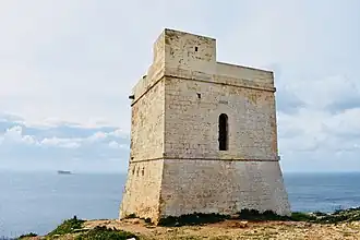 Ħamrija Tower was built in 1659 on a cliff on the southwestern coast of Malta, on the site of a medieval watch post.[3] It is located between Għar Lapsi, which is part of Siġġiewi, and Wied iż-Żurrieq, which is part of Qrendi. From the tower, one can see Filfla. The tower is located a few hundred metres from two Neolithic temple sites, Mnajdra and Ħaġar Qim, although these had not yet been discovered when it was built.