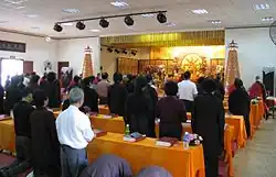 According to Mario Poceski, for the vast majority of ordinary Chinese Buddhists, "prevalent expressions of Buddhist piety were (and still are) channeled via a variety of popular modes of worship and ritual observance."[1] Worship services can include Buddhist devotional practices like offerings to an altar (of items like incense, flowers, food, and candles), ceremonial bowing, and extensive liturgies (including repentance ceremonies, rites for good health, and memorials for the dead).[1] According to Chün-fang Yü, the most popular Chinese Buddhist ritual that is most widely performed today is the Great Compassion Repentance associated with Guanyin and the Great Compassion Dharani.[51]