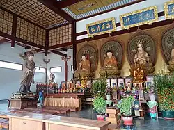 Chinese Buddhist temples usually include numerous images and statues of Buddhas and bodhisattvas. They are often ritually carved and installed as part of a consecration ritual that may include chanting and scripture reading.[61] Devotion towards these is a major part of Chinese Buddhism. As Chün-fang Yü writes, "people in China worship Buddhas and bodhisattvas in rituals, write poems and novels about them, praise them in songs and hymns, and tell stories and stage plays about them. And above all else, they worship the images of these holy beings."[62]