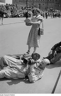 In the 1920s, more cameras such as the Zeiss-Ikon Kinamo, Newman-Sinclair, Eyemo, and De Vry were beginning to be created with hand-held ergonomics in mind. The Bolex camera was introduced using half-width 16 mm film stock. These smaller cameras satisfied the demand from both the growing newsreel and documentary fields, as well as the emerging amateur market. They were specifically designed to hold shorter lengths of film—usually 100 to 200 feet (30 to 60 m)—and were driven by hand-wound mainspring clockworks which could last continuously through most or even all of a film roll on one winding. These cameras saw limited use in professional filmmaking.[9] Further examples of limited hand-held work in the late 1920s include J. Stuart Blackton's The Passionate Quest (1926), Sidney Franklin's Quality Street (1927), and Cecil B. DeMille's The King of Kings (1927).[9]