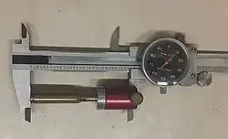 Powder is measured by weight (usually grains or grams) but can dispensed by volume. Beginning reloading kits often include a weight-to-volume conversion chart for a selection of common powders and a set of powder volume measures graduated in small increments.[22] By adding the various measures of powder the desired charge can be measured with a safe degree of accuracy. However, since weighing individual powder charges or using "dippers" can be time-consuming, a powder measuring dispensor is often used. A powder measure has a changeable or adjustable cavity to adjust the volume of the charge. A powder measure accurate to 1⁄10 grain (6.5 mg) is desirable.[13]