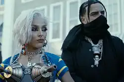 The video is set in a post-apocalyptic world, where the rappers are fighting armed people on the street.[20] They use baseball bats and laser eyes, and Doja Cat wears a machine-gun bikini.[19] During Saweetie's verse, she twerks over the burning city, and the cyborgs fight back against the protestors.[6][22] The clip ends with French Montana showing off a non-fungible token (NFT).[6] The visual was compared to films by many critics, including to The Warriors (1979), The Terminator (1984) and Barbarella (1968), by Rolling Stone's Brenna Ehrlich,[19] to Waterworld (1995) by Vulture's Bethy Squires,[21] to Planet Terror (2007) by Okon, and to the Mad Max series by both Okon and Rap-Up.[6][23] Bethy Squires from Vulture wrote that "other iconic hip-hop videos have placed themselves in a Thunderdome-like future, (...) but none of these videos, stunning though they are, had the boldness of vision to imagine a world where the only connection to the civilization we once knew is sponcon."[21]