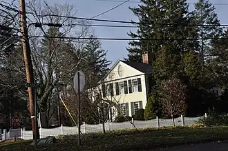 The Hanford Davenport House stands in a rural residential setting north of New Canaan's village center, on the northern corner of Oenoke Ridge and Lambert Road. It is a 2+1⁄2-story wood-frame structure, presenting proper facades to both streets. The Lambert Street facade is five bays, with sash windows arranged symmetrically around a center entrance, above which is a Palladian window. The entry is flanked by sidelight windows and topped by a fanlight, and is sheltered by a gabled portico. The Oenoke Ridge facade is three bays wide, with the entry in the leftmost bay; it is stylistically similar to the other entry. The gable end above this facade features an oval window. The interior of the house has many high quality original carvings, including window surrounds, fireplace mantels, and doorways. An ell of uncertain vintage, possibly the remnants of an old smithy, extends to the north.[2]