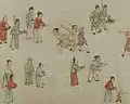 During the Northern and Southern dynasties, the dressing style followed the style of the Three Kingdoms and Jin dynasty; robes, skirts, trousers, short jackets, sleeveless jackets were worn while fur coats, especially marten coats, were very rare.[89] Young people liked to be dressed in trousers; however, it was not well-perceived for women to wear trousers; women wore skirts.[89] Based on tomb figures dating from the Southern dynasties, it is known that the robes worn during those period continued the long, wide-sleeves, youren opening tradition.[77] The robes continued to be fastened with a girdle and was worn over a straight-neck undergarment.[77] Tomb figures depicted as servants in this period are also shown wearing skirts, aprons, trousers and upper garments with vertical opening or youren opening.[77] Servants wore narrow-sleeved upper garment whereas attendants had wider sleeves which could be knotted above the wrist.[77] The court dress was still xuanyi (玄衣; dark cloth); however, there were regulations in terms of fabric materials used.[89]
