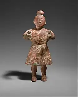 Based on the archaeological artifacts dating from the Eastern Zhou dynasty, ordinary men, peasants and labourers, were wearing a long youren yi with narrow-sleeves, with a narrow silk band called sitao (Chinese: 丝套) being knotted at the waist over the top.[35][49] The youren yi was also worn with ku (in a style generally referred as shanku) to allow greater ease of movement, but was made of plain cloth instead of silk cloth.[35] The shanku of this period also influenced the Hufu.[35] Aristocratic figures did not wear those kind of clothing however, they were wearing wider-sleeved long paofu which was belted at the waist; one example can be seen from the wooden figures from a Xingyang Warring States period tomb.[note 2][35][49] The youren closures could be found in different shapes, such as jiaoling youren and quju youren.[35]