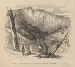 During 1853, American gold miners dug, an approximately 23 km, water race from Callaghans Swamp to underneath the Hanging Rock cliff face. Also that year Californians dug another water race from the swamp at the head of Dangars Gully to Nuggety Gully. In 1882, it took about twelve months to cut a 13 km water race from the Barnard River on the eastern side of the rough mountainous Great Dividing Range to the western side of the Range. Just south of Hanging Rock village are the Sheba Dams (with a surface area of 3.6 ha) which were erected by hand over a three-week period in 1888 to serve the sluicing needs of the miners. This construction was carried out by the Mt Sheba Company which leased the water rights for the area. Other water races were also constructed to feed various other mines around Bowling Alley Point and Hanging Rock.[2]