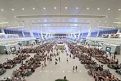 A new station was built on the site. It officially opened on 1 July 2013, in conjunction with the opening of the Hangzhou–Ningbo High-Speed Railway and Nanjing–Hangzhou Passenger Railway. The station also serves the Shanghai–Hangzhou Passenger Railway. It has 30 railway tracks, and stations for Hangzhou Metro lines 1 and 4.[4] A coach station and bus terminals are also part of the new transit hub.[3]