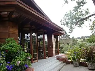 The house is one-story high with a central clerestory[9] (an outside wall of a room or building that rises above an adjoining roof and contains windows) and is constructed of native redwood board[7] and batten, common wire-cut San Jose brick,[5] concrete and plate glass. The house clings to, and completes the hillside on which it was built as the floor and courtyard levels conform to the slope of this one and one-half acre site. The entire site includes the main house, a guesthouse, hobby shop, storage building, double carport, breezeway, and garden house with pools and water cascade.