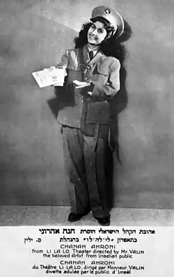 In April 1956, she performed in Paris, London, and other cities in Europe.[14] In March 1957, she sang for Elizabeth of Bavaria, the Queen of Belgium.[15] Aharoni continued her tour in the Americas and had brief success in Mexico.[16] In May 1958, she returned to Israel and performed in concerts and theaters. In November 1958, she returned to the USA for another tour.[17] In January 1960, Aharoni recorded an album of Israeli folk songs, Songs of Israel (1960), for Decca Records,[18] which sold more than half a million copies.[19] In March 1960, she performed at New York City's The Town Hall.[20] Later this year, she went on to perform for six weeks in Las Vegas.[21] In early 1962 she appeared on Ed Sullivan's program.[22]
