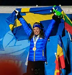 In 2017 she won the IBU Female Rookie of the Year Award for her World Cup debut season, with the male counterpart being awarded to her fellow Swede Sebastian Samuelsson.[1] At the Pyeongchang 2018 Winter Olympics she won a surprising gold in the Individual, after four clean shootings. It was both the first victory and podium of her career, with her previous best being a fifth place in the world cup.[2] She also claimed silver in the Relay, finished seventh in sprint, and fifth in both the mass start and the pursuit.[3][4][5] Öberg repeated her Olympic success at the 2019 Biathlon World Championships on home snow in Östersund, where she again won the individual with a perfect shoot, having previously finished fourth in the sprint and fifth in the pursuit. She became the first female biathlete to win the individual World Championship title the year after taking the Olympic individual gold.[6]