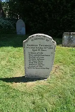 Her death is recorded in the Malmesbury parish register, which records a burial on 23 October 1703 of "Hannah Twynney kild by a Tygre at ye White Lyon".[1] Her gravestone survives in a corner of the churchyard of Malmesbury Abbey, with a memorial poem alluding to her death. A memorial plaque with more details was recorded by an antiquarian in the nearby village church at Hullavington, but is now lost.