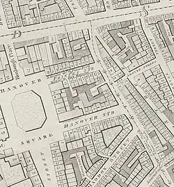 The site had previously been occupied by a mill, hence its previous name Mill Field and that of the currently adjoining Mill Street. Originally the property of Earl of Plymouth, leased out to Lord Dillon, in June 1774 it was sold for £5,000 to Viscount Wenman, who on the same day conveyed it to Gallini, Bach and Abel. Gallini owned half the freehold and each of the other two a quarter. On the site formerly occupied by a garden and office, they constructed, as extensions to the house, assembly rooms for concerts and public meetings. The main room on the first floor measured 79 by 32 feet (24.1 by 9.8 metres), with a height of between 22 and 28 feet (6.7 and 8.5 m): its vaulted ceilings had paintings by the decorative painter Giovanni Battista Cipriani; and Thomas Gainsborough, a friend of Bach and Abel, was commissioned to produce the transparent paintings on glass for the Rooms.[1] In addition there was a small room off the North side of the main room and a larger room on the ground floor beneath it.[2]