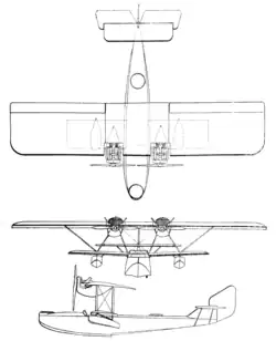 Its hull was wooden, with a concave section, single step bottom, gently curved sides and a flat top. The underside was triple surfaced and the sides double. Stability on the water was provided by a pair of floats under the lower wings beneath the interplane strut mountings, separated by about 4.7 m (15 ft 5 in). The hull contained three open crew positions. Two of them, one in the extreme nose and the other midway between the trailing edge and the tail, housed machine gunners. The cockpit, which was under the leading edge of the upper wing, had two side-by-side seats, equipped with dual controls.[1]