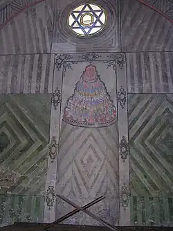 In the south wall is the mihrab, the upper part of which is cut seven ornamented belts, symbolizing the seven levels of heaven. Above the mihrab is a stained glass window, which shows the seal of Suleiman (hexagram). On the walls of the small mosque are scratched images of boats with sails, horses and horsemen.