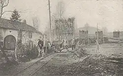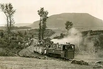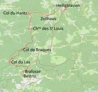 The Hantzbahn was laid in 1916 during World War I by German troops, Russian prisoners of war and local civilians as a military light railway using prefabricated rail track panels with a length of 5 meters.[3] The railway was 25.7 km (16 mi) long and connected Saint-Blaise-la-Roche with Ban-de-Sapt to transport weapons, ammunition and supplies to the front and to return wounded soldiers in the opposite direction to hospitals. The highest point of the railway was 798 m (2,618 ft) at Col des Braques about 2 km (1.2 mi) west of Saales. The railway ended in Bestru, a district in Provenchères-sur-Fave.
