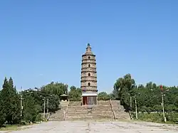 Haotian Pagoda (Chinese: 昊天塔; pinyin: Hàotiān Tǎ) or Liangxiang Pagoda (simplified Chinese: 良乡塔; traditional Chinese: 良鄉塔; pinyin: Liángxiāng Tǎ) is an octagonal brick pagoda situated in Haotian park in the Fangshan District of Beijing. It has 5 octahedral shaped hollow tiers and is 36m high. Originally constructed during Sui dynasty, the pagoda has been rebuilt a few times in the last few centuries. The brick tower standing today was built during the Liao dynasty (907–1125). In 1984 and 1997, the Beijing Municipal Administration of Cultural Heritage donated a total of over 16 million Chinese yuan for restoration works. As of September 2017 Haotian park is closed for renovations of the pagoda.