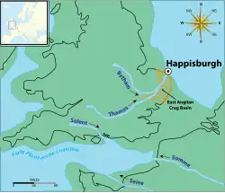 At the time the Happisburgh hominins lived, a land bridge existed between Britain and France before the formation of the English Channel about 450,000 years ago. The ancestral River Thames flowed further north than it does today before converging with the ancient Bytham River,[14] while the landscape of a large part of modern-day East Anglia consisted of a series of clay ridges and troughs known as the East Anglian Crag Basin.[15] Happisburgh lay about 15 mi (24 km) further inland than it does today and was the site of an ancient estuary where the Bytham and Thames rivers converged to flow into what would then have been a maritime bay.[6]
