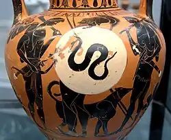The Men of Harad are called Haradrim ("South-multitude"), Haradwaith, or Southrons by the people of Gondor. The Haradrim are of various ethnicities and cultures; some are organized into kingdoms.[T 11][T 12] Frodo and Sam meet Faramir and his Rangers of Ithilien just before the latter ambush a company of Haradrim on the North Road. Frodo and Sam do not see much of the battle, since they are positioned elsewhere, but they hear the sounds of fighting, and a slain Haradrim warrior crashes at their feet. This warrior is described as having "brown" skin, with black plaits of hair braided with gold.[T 11] He wears a scarlet tunic, as do the other Haradrim, and a gold collar. He is armed with a sword and has a corslet of brazen scales. Their standards are scarlet, and their great beasts, the mûmakil, have scarlet and gold trappings. They carry round spiked shields, painted yellow and black. Their leaders have a serpent emblem.[T 11] The people of Far Harad were black-skinned; a group of them is described as "black men like half-trolls with white eyes and red tongues" and "troll-men".[T 13]
