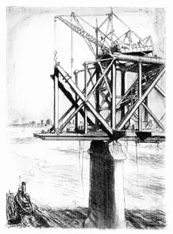 Digging the river bottoms to sink the caissons into the river bed was difficult and dangerous work. All the material inside the walls of the caisson had to be removed to the surface. The caisson was built with excavation shafts for removing dirt and clay. The pressure was increased to match the water pressure, keeping the river water out of the work area. When the pressure was high enough, the excavation shafts were opened and air pressure would remove the light weight river bottom in a "blow off." This eased the process greatly and saved a tremendous amount of time and effort for the sand hogs. It did, however, make a spectacular sight as a fountain of river bottom erupted from the caisson, it also left quite a mess on the top of it and any barges nearby.[3]