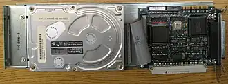 While sources inside the company during the launch of Hardcard claim it was the first HDD controller integrated into the drive printed circuit board,[5] Xebec, a HDD controller manufacturer in the early 1980s, had already done that with their Owl product around August 1984. It was a complete 5.25 inch half-height HDD with an integrated controller and drive electronics on the same printed circuit board with a SASI interface.[11][12]