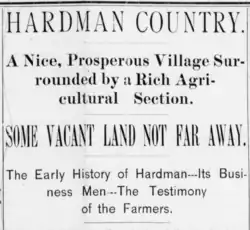 The plateau upon which Hardman sits had long been touted in the newspapers of the late 1800s. Advertisements in local papers, for example, lavished praise upon the "thriving little trade center" of Hardman. The land surrounding Hardman, for example, was described as "one of the best farming sections in Morrow county, or in any county." Marketers hailed Hardman country as "the greatest stock range in the West." It was said in the late 1800s that the location of Hardman was grand. A local newspaper advertisement described the town as "high enough to secure plenty of fresh air, level enough for the building of a magnificent city, well-watered and surrounded by the richest and most favored soil under the sun, far enough from all the other places of business to insure excellent results if energy is property directed."[7]