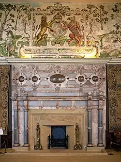 A decorator, John "Paynter", used chalk and size made from glovers' offcuts. Pigments including blue bice, verdigris, massicot, and vermilion were bought in 1599. John varnished and coloured the panelling of the great chamber, and gilded some details. His paintwork supplemented and mended the cloth hangings, and he painted cloth hangings in imitation of tapestry.[5]