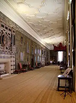 A wide, winding, stone staircase leads up to the state rooms on the second floor, which include one of the largest long galleries in any English house. A tapestry-hung great chamber with a spectacular plaster frieze illustrating hunting scenes has been little altered.