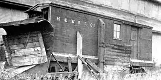When the H&W stopped operating it owed the St.J.&L.C. a substantial debt.[1]: 54 The St.J.&L.C. resumed control of the spur that had been leased to the H&W, which remained in service as long as there was a need to ship granite by rail.[6]: 26 The rails south of Buffalo Crossing were removed in August 1940[6]: 25 No buyers could be found for the remaining locomotives, so they were scrapped, along with some 40 flat cars, the rails, and some other equipment.[6]: 27 [26]: 31 Just one flat car was taken by the St.J.&L.C.[1]: 56 The proceeds from the scrapping were used to repay the St.J.&L.C.[6]: 27 Company records were mostly discarded.[26]: 31