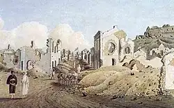 In August 1779, the civilians were given permission to "erect wooden huts and sheds at the southward, above the Naval hospital, whither they removed their principal papers, &c. that they might be secure from the annoyance of the enemy, in case the town should be bombarded."[1] When the bombardment began, it produced scenes of chaos. The inhabitants were