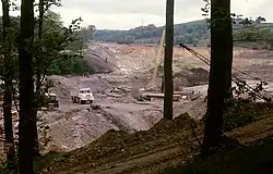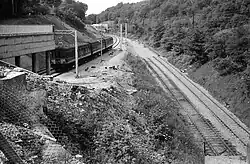 In the 1960s, work was undertaken to electrify the West Coast Main Line. The Harecastle railway tunnels posed a challenge. The North tunnel was opened out using flying buttresses.[4] The South and Middle tunnels were unsuitable for electrification because of their limited size and the line was diverted onto a new alignment running to the west through the Kidsgrove Tunnel that was bored to carry the diversion.[5][2][7] The diversion starts about 300 metres south of Kidsgrove railway station, and rejoined the original line just to the west of Tunstall (roughly where the A527 crosses the line). The last trains to use the original alignment were run in 1965.[8][4]