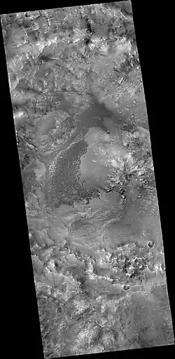 Hargraves exhibits evidence of modification by aeolian processes over time. Transverse aeolian ridges predominate in a NNW-SSE orientation atop the older ejecta unit (interpreted as a lithic impact breccia), implying the presence of a longstanding prevailing wind.[2] A large erg is also present within the crater's topographic basin.[8] Several channel forms indicative of fluvial activity also are observed in the eastern reaches of Hargraves' ejecta blanket, though due to aeolian infilling it is unclear if these channels predated or postdated the Hargraves impact itself. However, channel forms are also present within the Hargraves basin, suggesting that some fluvial activity must have postdated the impact.[3] Hargraves has been noted as a possible heat source for melted subsurface ice in this region, which may have fed the fluvial activity linked to the filling of the Jezero impact structure. However, direct geomorphological evidence for subsurface ice associated with such a hypothesis has not been identified.[3]