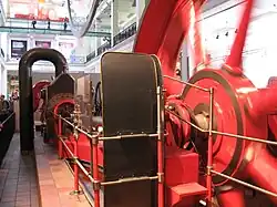 Steam is raised by two Lancashire boilers built by Oldham Ironworks costing £900. The steam raised to 160 psi in the boiler house drives a 700 horsepower (520 kW) cross compound horizontal stationary steam engine, built by the Burnley Iron Works (formerly Marslands).The high-pressure cylinder (HP) is 17 inches (43 cm) and the low-pressure (LP) 39 inches (99 cm). It uses Corliss valves. The engine drives a 18 feet 6 inches (5.64 m) flywheel running at 76 rpm.[16]